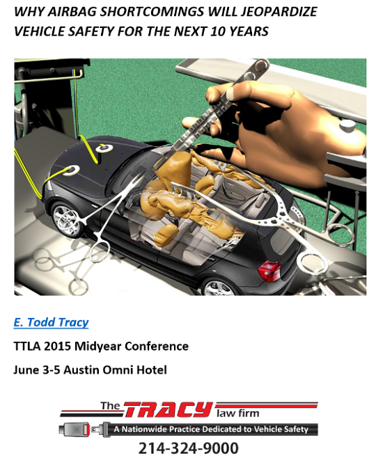 Vehicle Crashworthiness Trial Attorney E. Todd Tracy is speaking at 2015 Midyear TTLA(Texas Trial Lawyers Association) Conference and CLE Seminar on June 3rd 2015 at the Omni Austin Hotel Downtown. As a 2015 Board of Directors for TTLA, Mr. Tracy will be speaking on “Why Airbag Shortcomings will Jeopardize Vehicle Safety for the Next 10 Years“